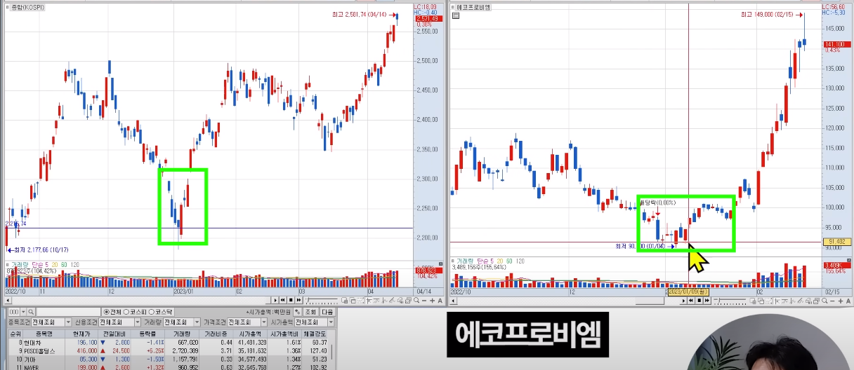 지수를 이기거나, 처음 양봉이 뜬 종목