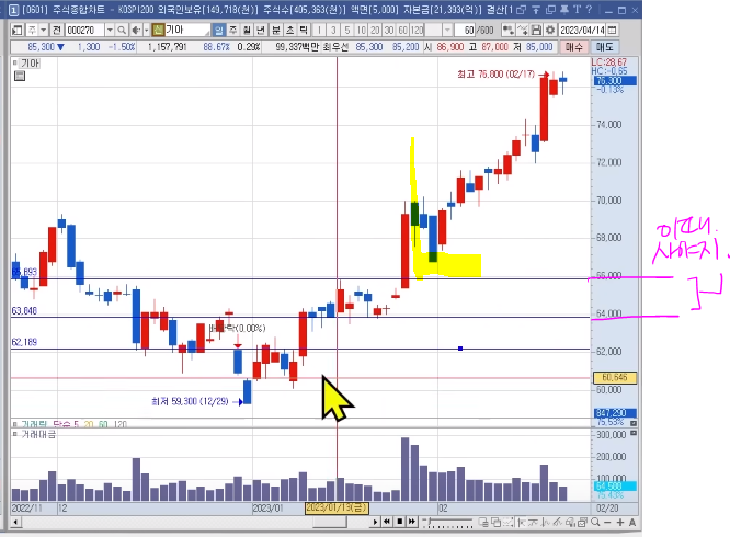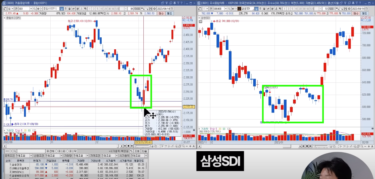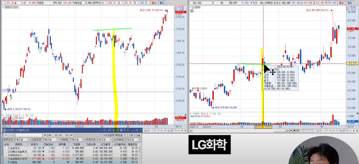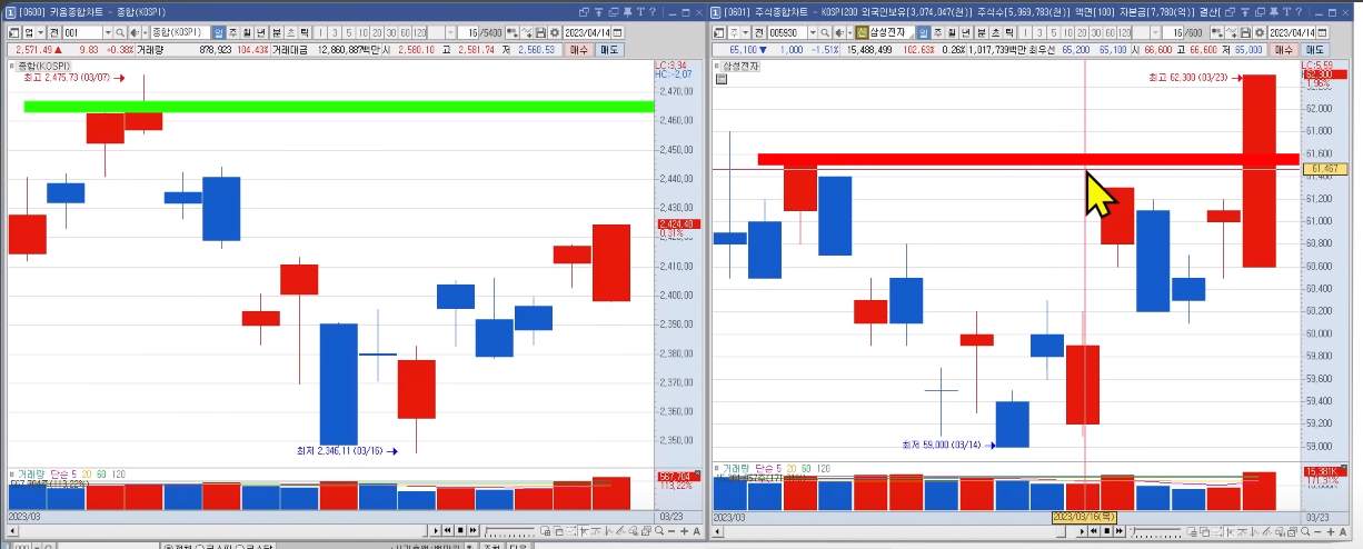 23년 3월초 코스피 지수를 보면 전 고점 돌파를 하지 못했다. 하지만 삼전은 돌파 했다.
